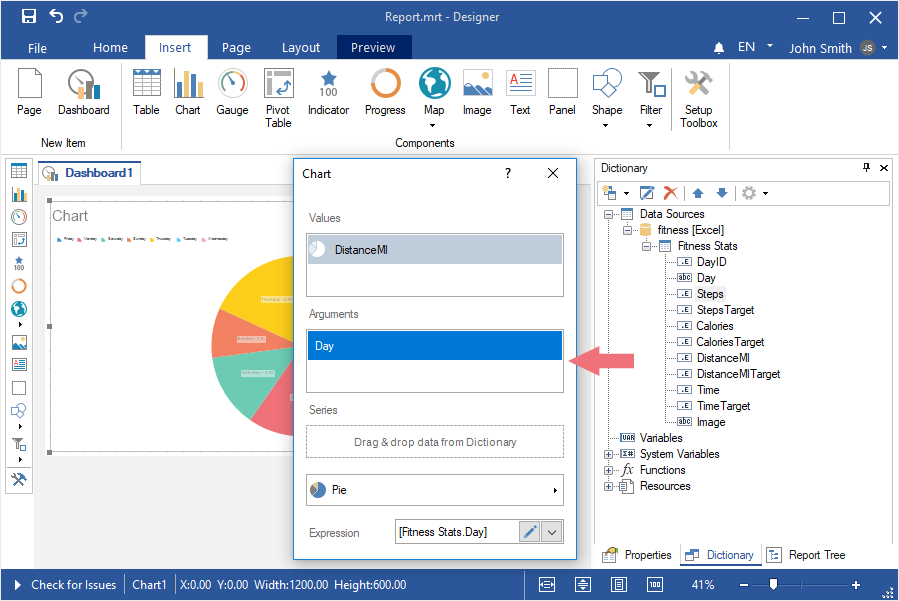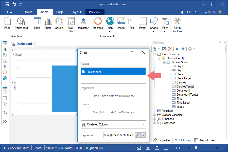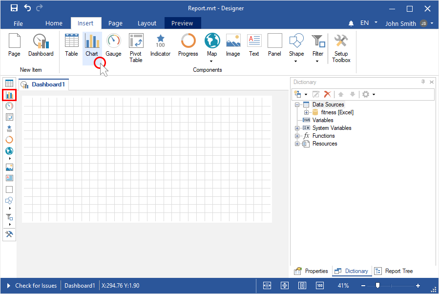 Step 4: Select the Chart element in the toolbox of the report designer or on the Insert tab;