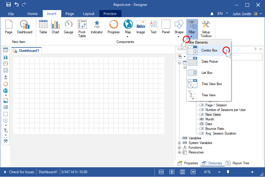 Step 4: Click on the Filters category in the Toolbox of the report designer or on the Insert tab;