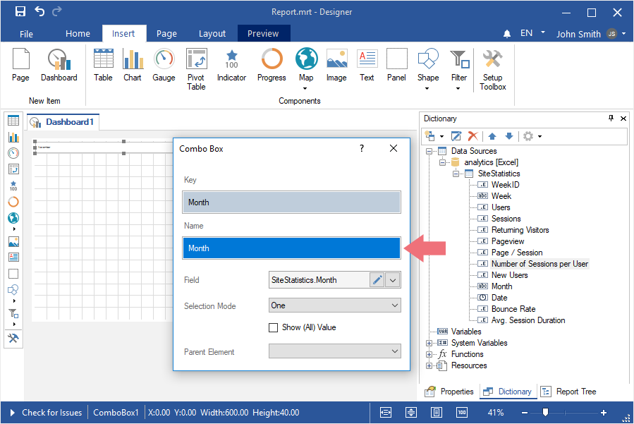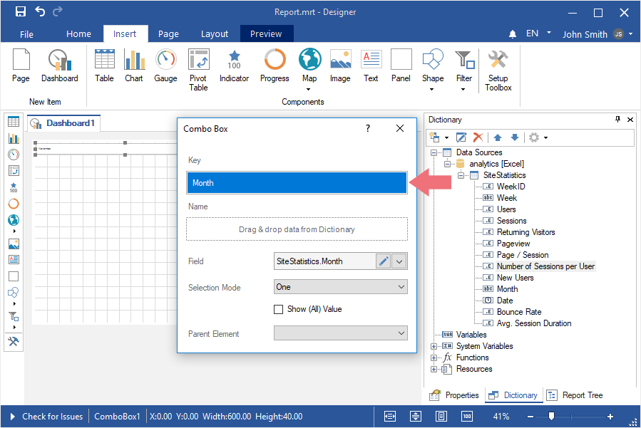 To create a dashboard with the Combo Box element, you should make the following actions: