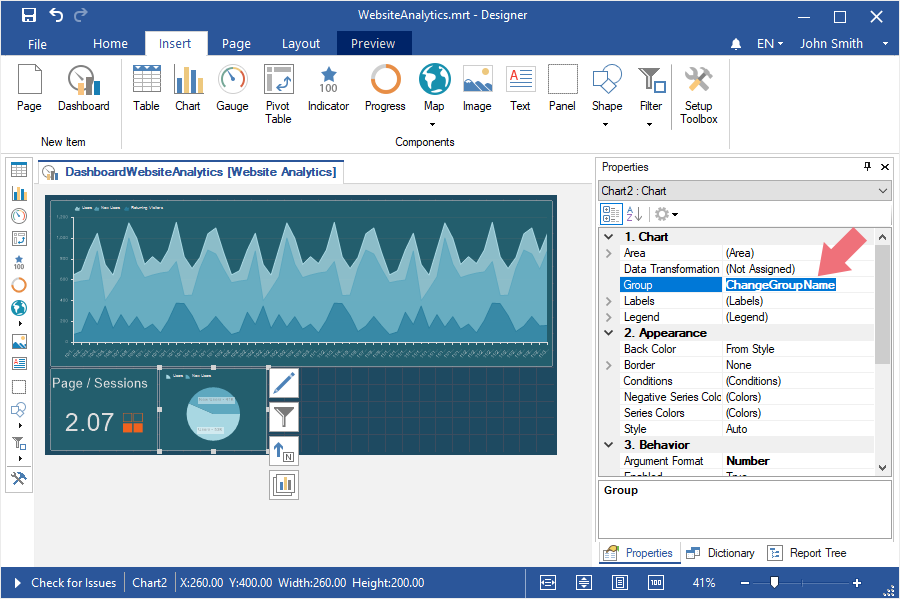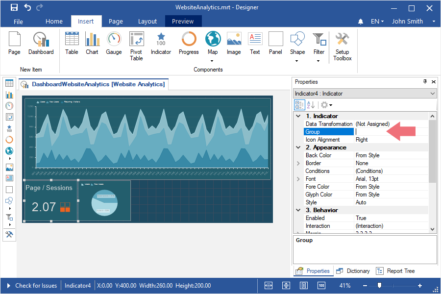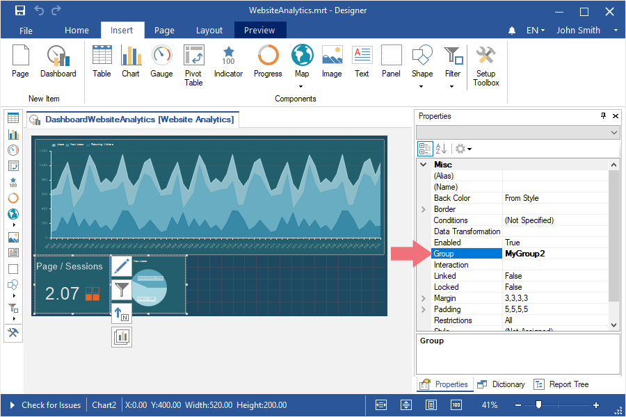 Step 3: Assign the name of a group in the Group field in the properties panel in the report designer.