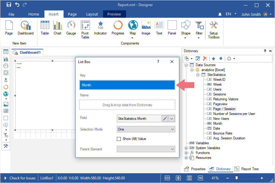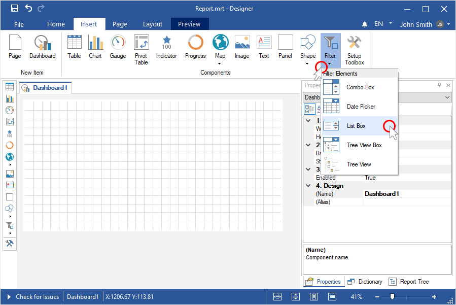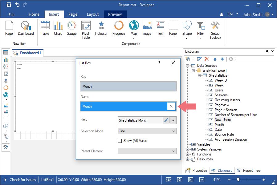 To create a dashboard with the List Box element, you should make the following actions: