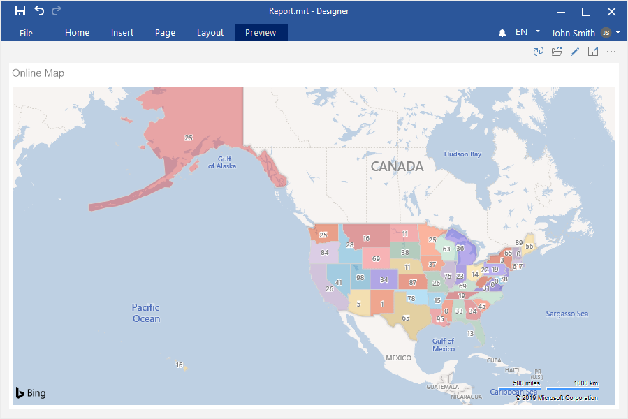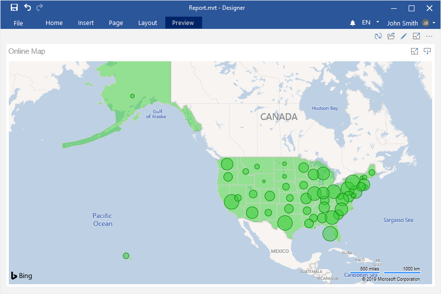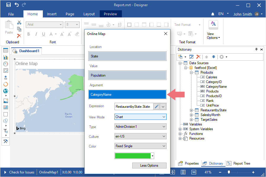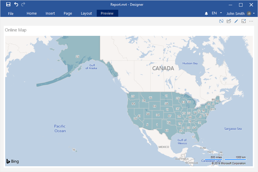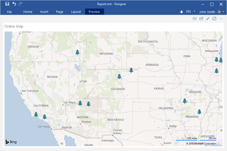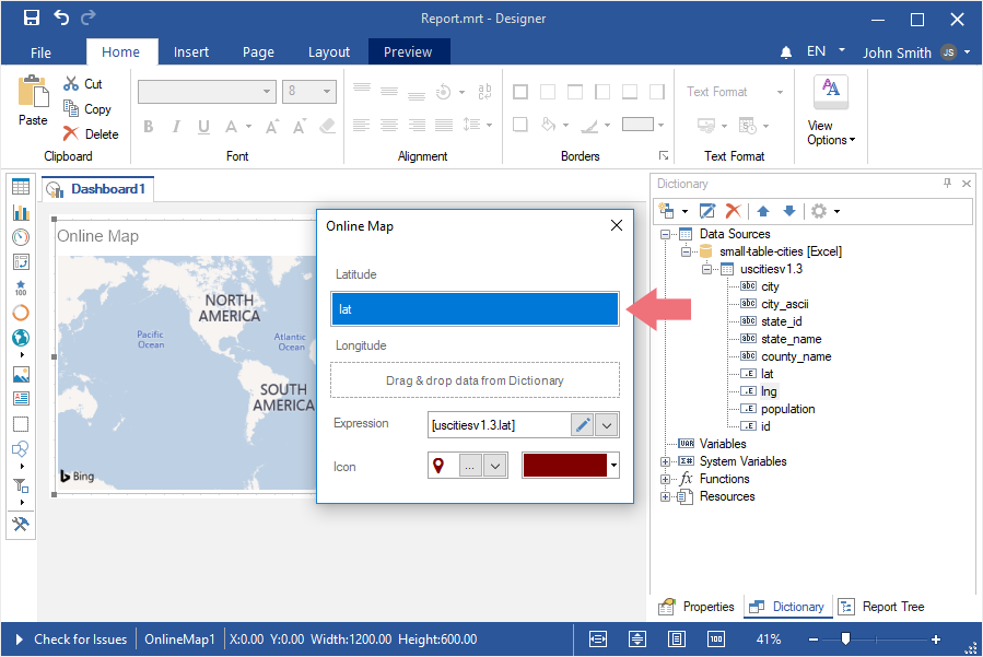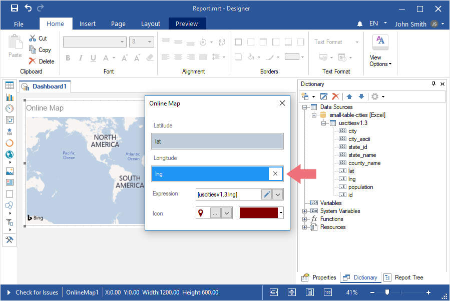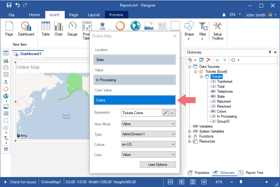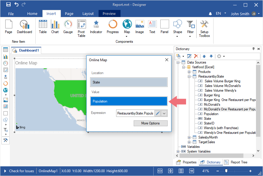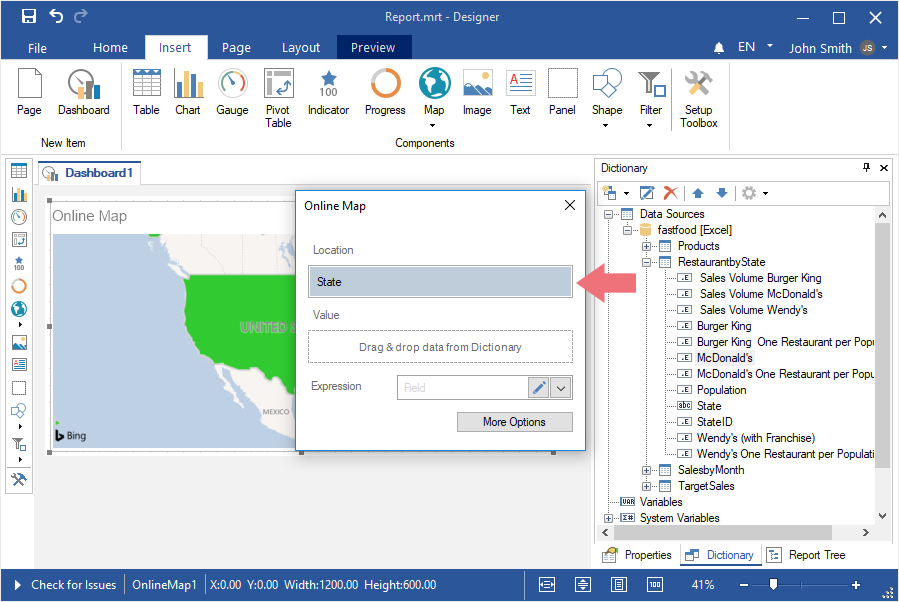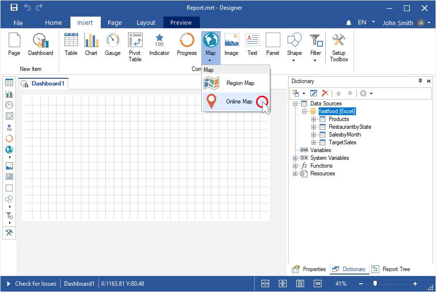 Step 4: Select the Online Map element in the toolbox of the report designer or on the Insert tab;