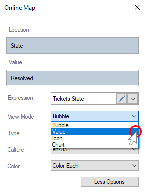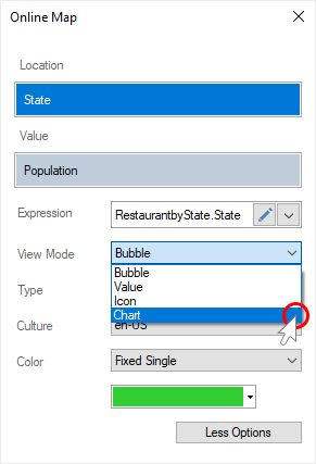 This functionality is available only for online map by location. To display a chart of values on an online map, you should do the following: