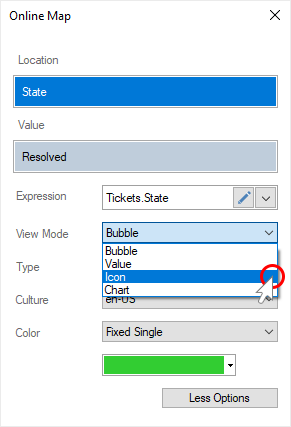 By default, geographic objects are displayed on the map as bubbles. They can also be displayed as a pie chart, values, values with an icon.