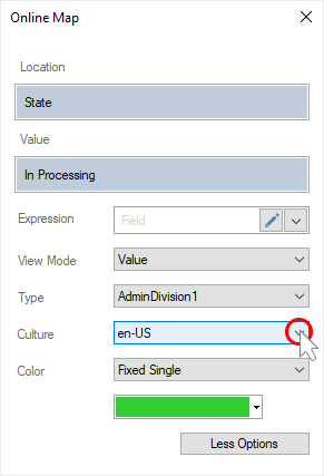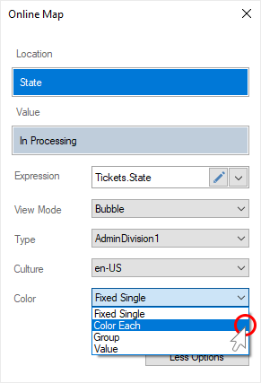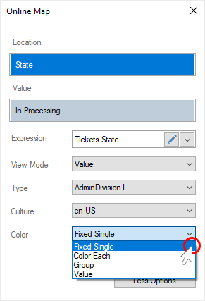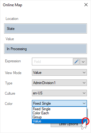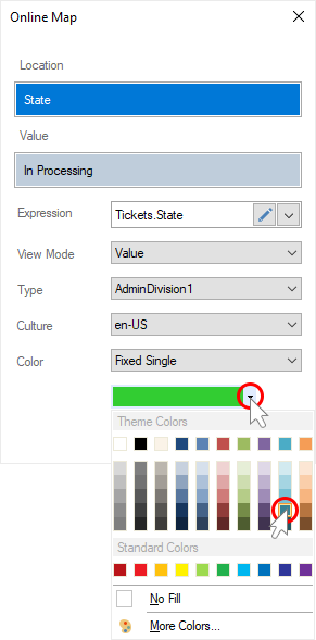 Step 4: Specify a data column with a list of colors for each geographic object in the Color Value field;
