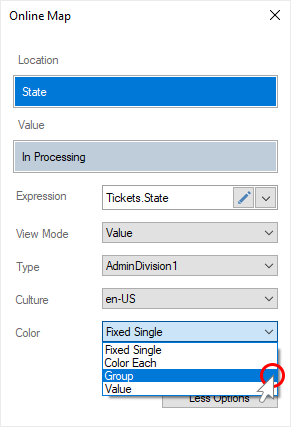 This feature is available only for online map by location. All geographic locations can be grouped by value, and a specific color will be applied to each group. To do this, you should do the following: