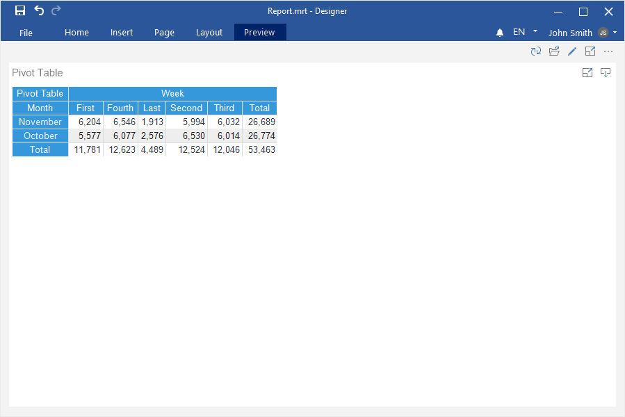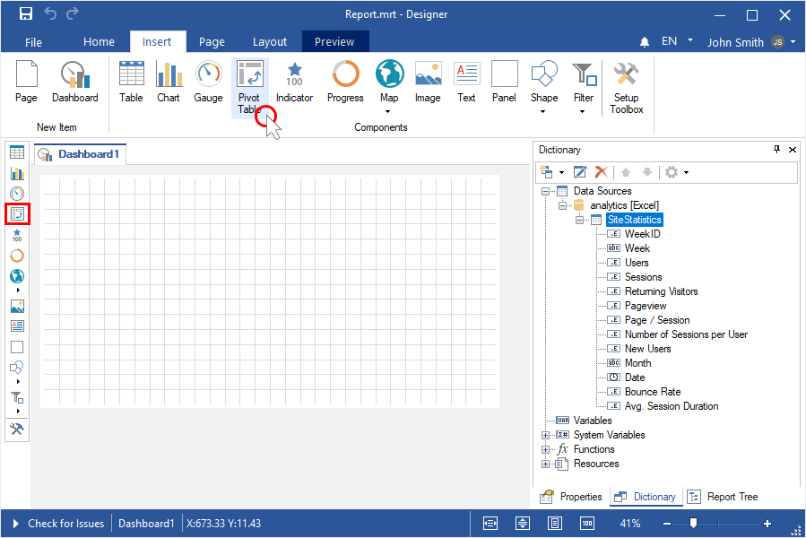 Step 4: Select the Pivot Table element in the toolbox of the report designer or on the Insert tab;