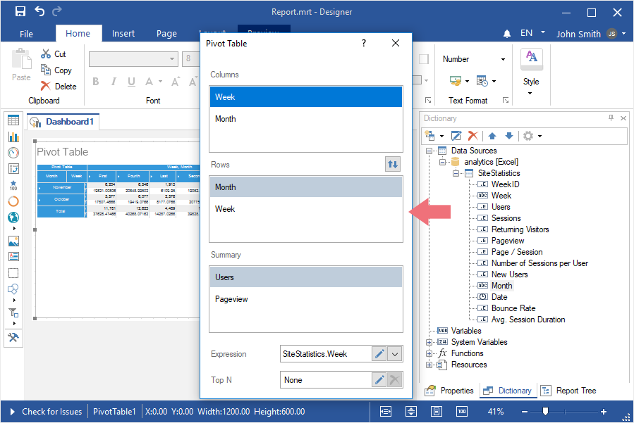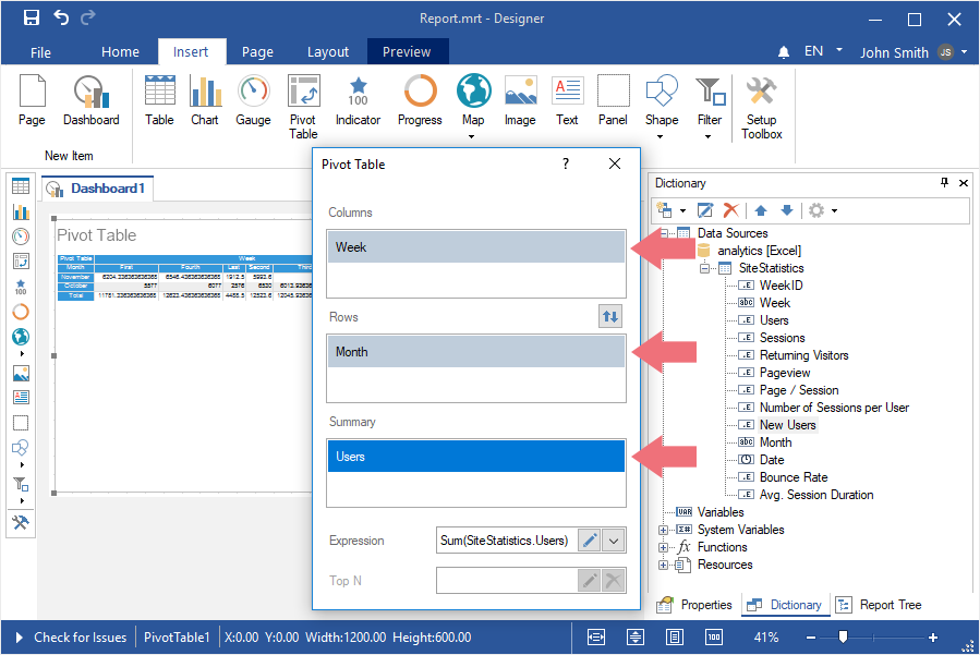 Step 7: Drag the necessary data columns from the data dictionary into the Rows, Columns, and Summary fields;