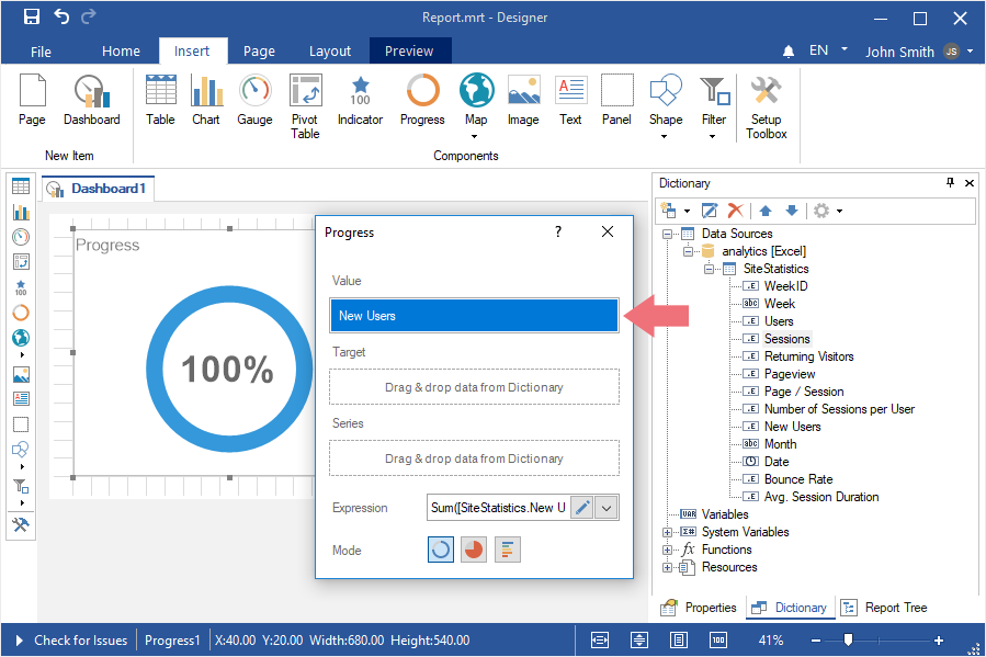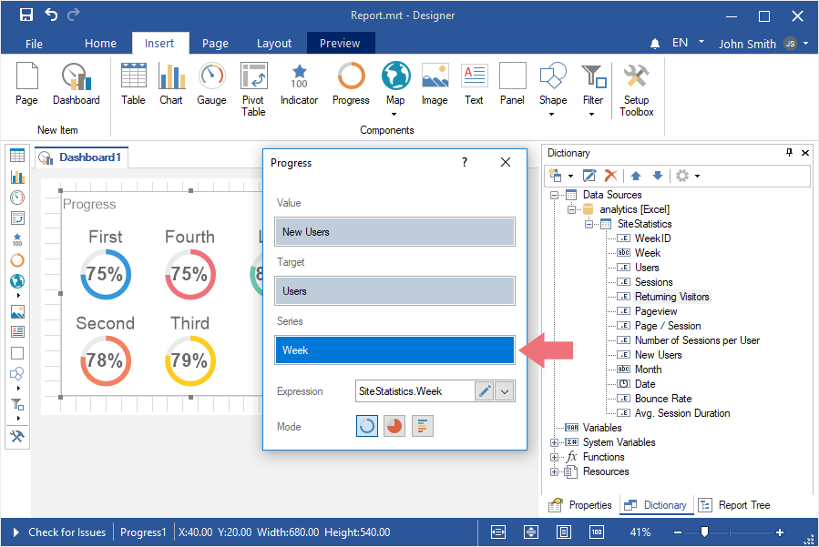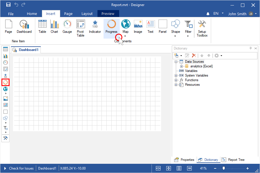 To create a dashboard with the Progress element, you should do the following: