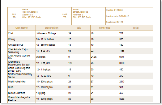 1. Render a report by clicking on the Preview tab or call the report Viewer using the Preview menu item. The picture below shows the rendered report with the invoice: