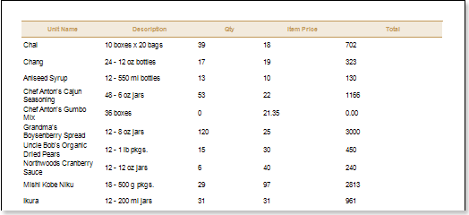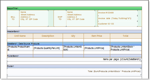 2. Put text components in the DataBand with expressions. Where the expression is a reference to the data field. Put text components with the expressions: {Products.ProductName}, {Products.QuantityPerUnit}, {Products.UnitsInStock}, {Products.UnitPrice}, and {Products.UnitsInStock * Products.UnitPrice};