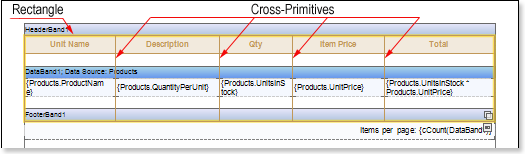 5. Add cross-primitives, which start points are located at the top of the HeaderBand, and the end ones - on FooterBand. The picture below shows the report template with the FooterBand, rectangle and primitives: