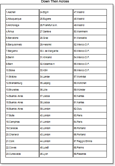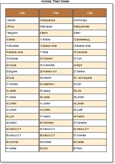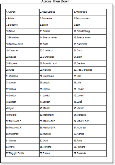 2. Click the Preview button or invoke the Viewer, clicking the Preview menu item. After rendering all references to data fields will be changed on data form specified fields. Data will be output in consecutive order from the database that was defined for this report. The amount of copies of the DataBand in the rendered report will be the same as the amount of data rows in the database. The picture below shows samples of reports with columns rendered using different values of the Column Direction property.