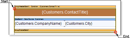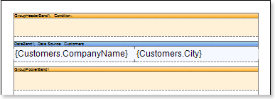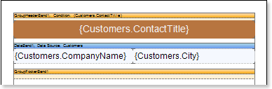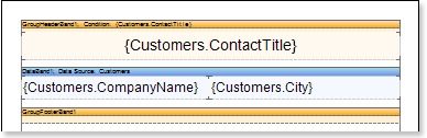 1. Set the condition of data grouping in the report using the Condition property of the GroupHeaderBand. Condition for the grouping can be set by specifying an expression or by selecting a column from a data source. In this example, we specify the {Customers.ContactTitle} expression of the grouping condition, so, when rendering the report, a list of companies will be grouped by the ContactTitle column data.
