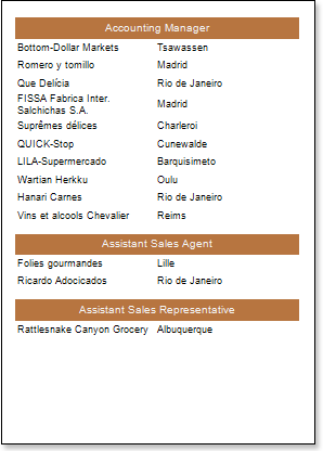 2. Put a text component in the GroupHeaderBand with the following expression: {Customers.ContactTitle}. So when rendering the report, as a group header, the entries from the ContactTitle data column will be output. Put a text component in the GroupFooterBand with the following expression: {Count ()}. The {Count ()} function will count the number of entries in each group.
