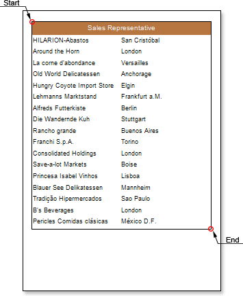 1. Click the Preview button or invoke the Viewer, clicking the Preview menu item. After rendering a report all references to data fields will be changed on data from specified fields. The picture below shows a rendered report page with grouping and the rendered Rectangle cross-primitive: