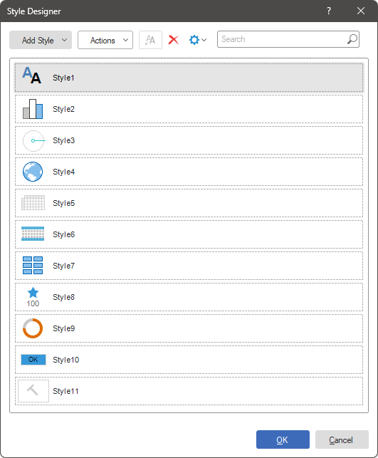 The style designer has a search feature that allows you to search for styles. To do this, enter the name of the style or a part of its name in the Search field, and the list of styles will be automatically filtered.