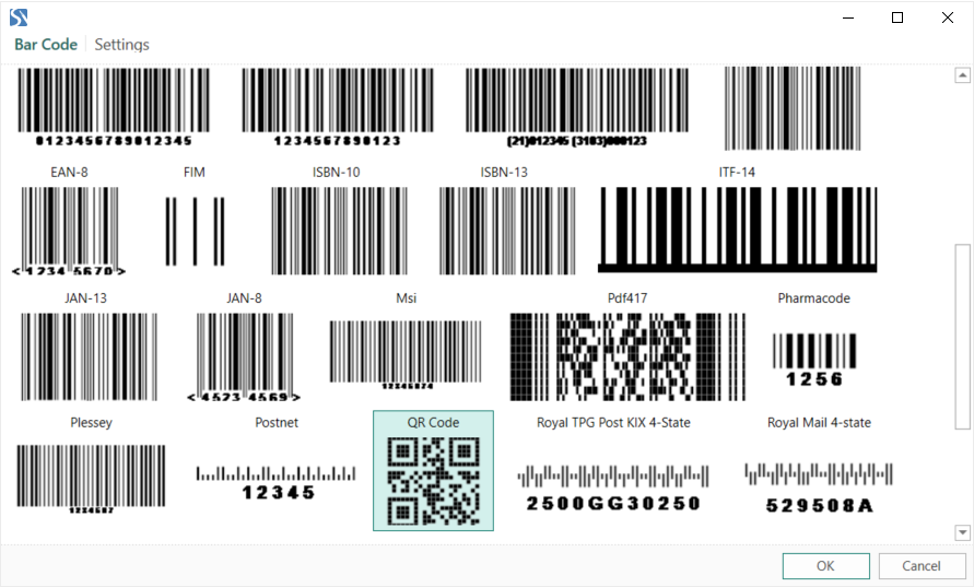 - The Bar Code tab. Select the bar code you need to use in the report. For example, the QR Code: