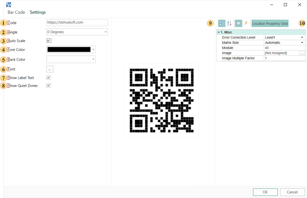 The Code field. Specifies a value that bar code will have. For example, you can determine a custom value. For the QR Code, it may be some text and numeric value. Also in this field, you can specify an expression. Then, the result of this expression will be the value of the barcode.