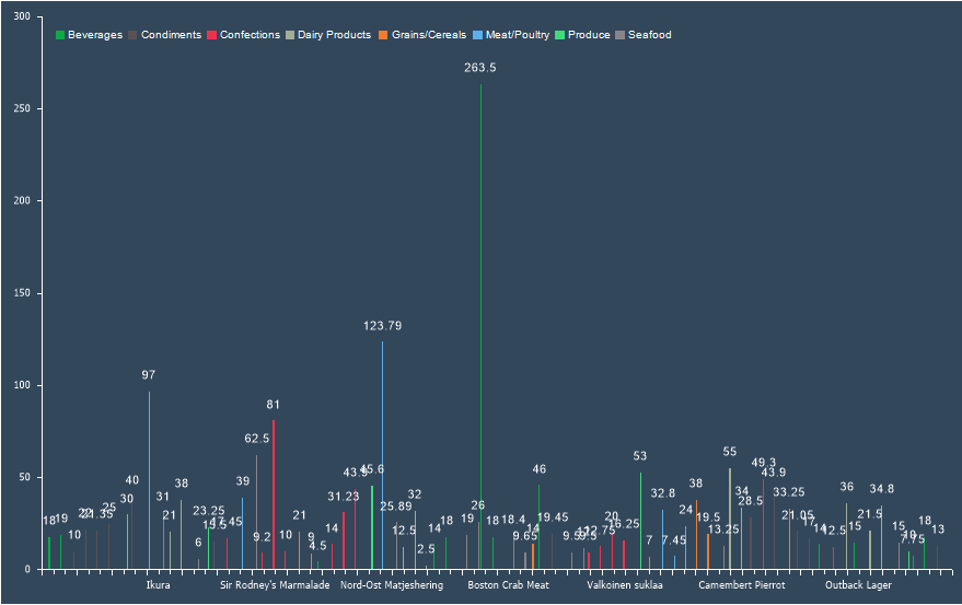 After creating a series, you need to specify data for it. For some series types, only a value is required, while others require values and arguments, or even multiple values along with arguments, etc. Series configuration, like chart configuration, is done in the component editor. Data columns (for values and arguments) can be specified as follows: