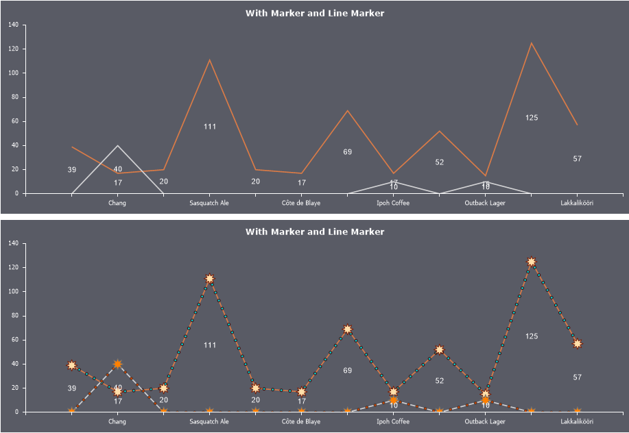A Line Marker is a graphical symbol used to display intermediate values along a line between the nearest series values. Line markers are available only for line-based charts, including Line, Area, Range, and their variations.