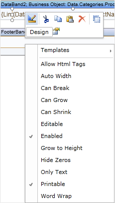 It is necessary to specify what data source will be used when you output lists in the Data band. It is important because report generator should know how many times the Data band must be printed. Therefore, the reference to the Data band is specified. This can be done with several ways. First, it is possible to use the Data band editor. To call the editor it is enough double-click on the Data band. Also it is possible to call the editor from the context menu. See below an example of this menu.