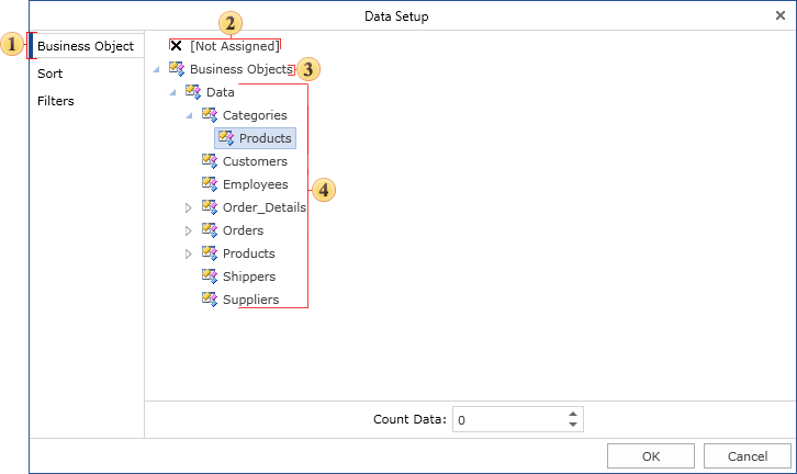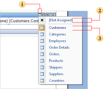 Data band editor allows quickly selecting data source. Data source is selected on the first bookmark of the Data band editor. All data sources are grouped in categories. Each category is one data connection with data in the Dictionary of Data. The picture below shows data in the Data band editor.