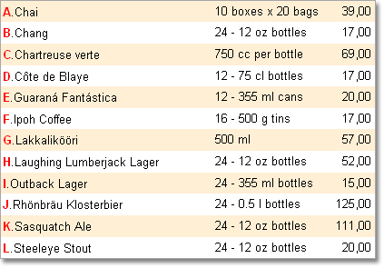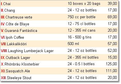 In addition to the Line, LineABC and LineRoman system variables can also be used for the list enumeration. The LineABC system variable returns the alphabetical index instead of a number of a row. The LineRoman system variable returns Roman numerals of a number of a row. For example, a report where the LineABC system variable is used is shown on the picture below: