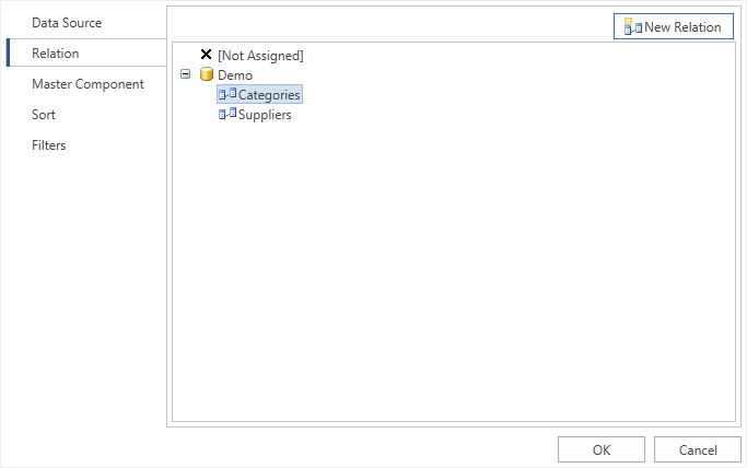Selection is done between relations which were created between Master and Detail data sources, and in which the Detail data source is subordinate data source. There can be more than one relation (for example, as seen on the picture above). Therefore, it is important to select the correct relation.