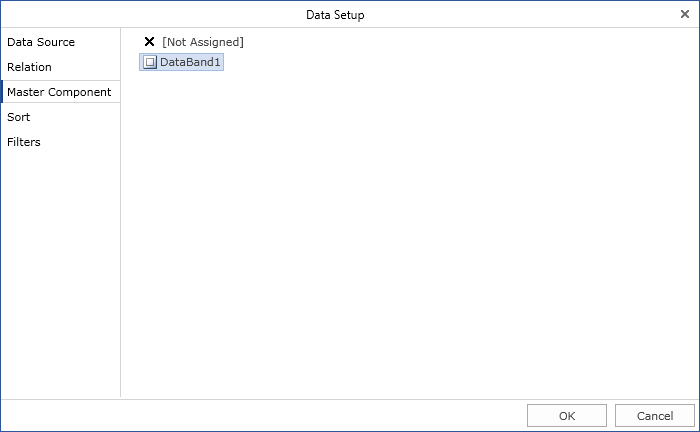 Put two Data bands on a page to start creating the Master-Detail report. Specify the Master data source to the first band (this is the Master band). Specify the Detail data source to the second band (this is the Detail). Then, it is necessary to bind these bands using the MasterComponent property of the second band. The Master band should be selected.
