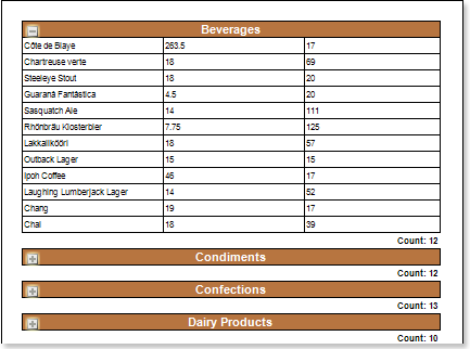 Now, when rendering a report, the group will have a look as expanding/collapsing blocks. To expand/collapse the block, you should click the title block. In this case, the group header. On the component for which the dynamic collapsing is enabled, is displayed if the block is collapsed the icon is displayed and the icon is displayed if the block is expanded. Note that you can collapse blocks with the the group footer. To do this, set the Interaction.Collapse Group Footer property to true.