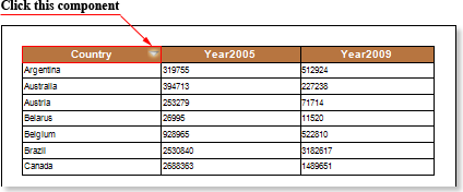When rendering the report without sorting, data are taken from the data source sequentially. To enable dynamic sorting you need to select the component when clicking it the sort direction will be changed. In this example, select text components in the Header Band. Then set the Interaction.Sorting Enabled properties for both components to true. In the fields of the Interaction.Sorting Column properties specify the data column to be used for sorting data. In this case, specify the column {Products.Categories.CategoryName} for the text component with the expression CategoryName, and for the text component with the expression ProductName specify the column {Products.ProductName}. Render a report. To sort data by multiple columns, you must click the components holding the Control button and change the sorting direction. The picture below shows a report page rendered with dynamic sorting by multiple columns: