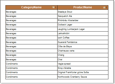 As can be seen from the picture above, when sorting by multiple columns, the data are sorted first by the first column. In this case, the categories are sorted in the Ascending direction. Then, data are sorted by the second column. In this case, the products are sorted in the Descending direction, but within each category. In other words, in the products category Beverages is ordered in the direction from Z to A, in the category Condiments, too, from Z to A, etc. To disable sorting by multiple columns, you must release the Control key and click the component with dynamic sorting.
