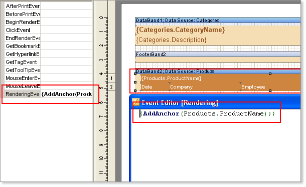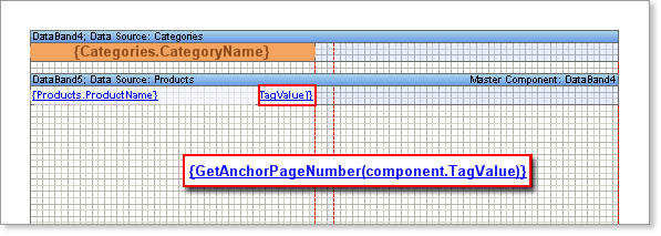 The component that contains an expression will be processed in the end of report building. So the value of the Products.ProductName field will be equal for all strings – the last in a list. That is why it is necessary to remember the value of the Products.ProductName field for every string when the content is being built. For this use the Tag property. On the second page the report is built. In the Rendering property of the DataBand component (used for the content building) the AddAnchor method is called. This method will return the current page in the moment of its calling.