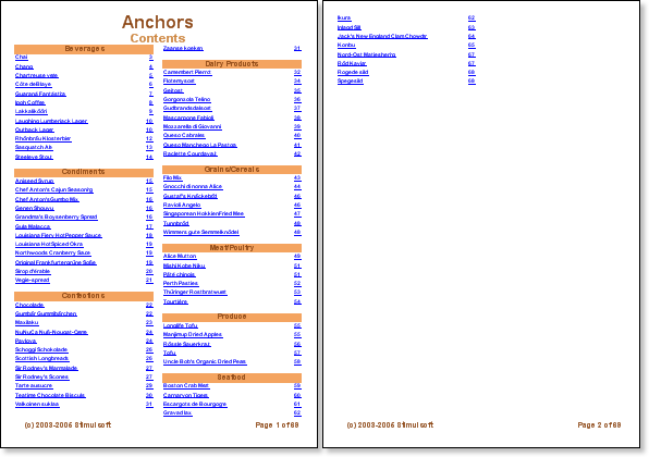 The anchor name is the value of the Products.ProductName field. As a result, the page number is rendered first. Then the second page is rendered and numbers of pages are saved. After the report rendering the report generator engine returns to the first page and numbers all pages.