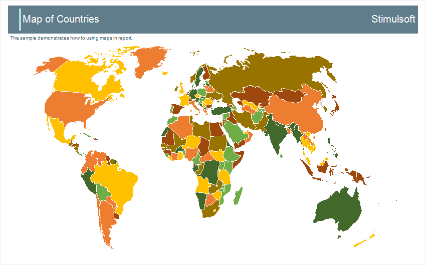 The Map component represents a tool to visualize data with reference to geographical location. With the help of maps, you can display various statistics for a particular region or in the world. For example, you can display the sales of any product for each state in the US or, for example, for each European country. The map may be placed directly on the page or other components like panels, bands, clones etc. Data for maps may be filled manually or obtained from the data source. The Map component can be setup in the component editor. To add the Map component in the report you should go to the Infographics menu on the toolbox or Insert tab: