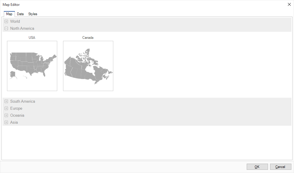 Setting the map can be done in the Map component. To call the Map Editor you should double-click the component in the report template or select the Design item from the context menu of the component. The map editor will be called. It has the following tabs: