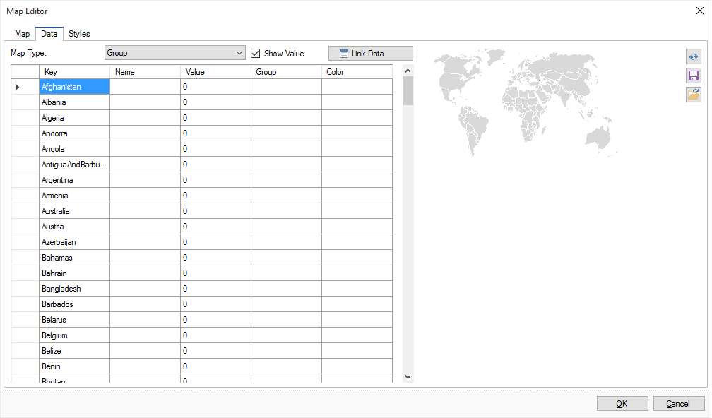 On this tab you can set the map type, the data for the map and map parameters. Data can be entered manually or derived from a data source.