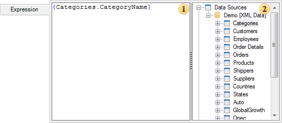 . At the same time, a reference will be automatically generated on the data dictionary item. In the picture above you see that the expression {Categories.CategoryName} is a reference to the description of the data columns CategoryName (data source Categories) in the report data dictionary.