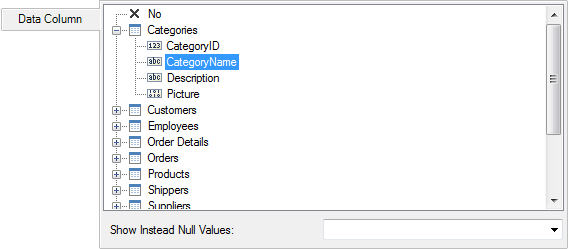 This tab is represented by a single panel, which displays only the data columns from the Dictionary. When you select a column, an expression will be formed. This expression is a reference to the description of this column in the report data dictionary. Also on this tab you may find parameter Show Instead Null Values, using which you can specify the characters to be displayed instead of the zero values of selected data columns.