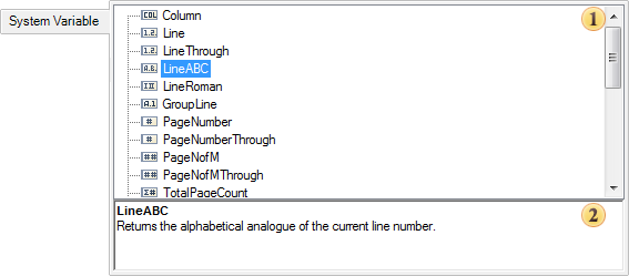 The panel System Variable. This panel displays all the system variables of the data dictionary. A system variable is selected here, which will form the reference in the text component.