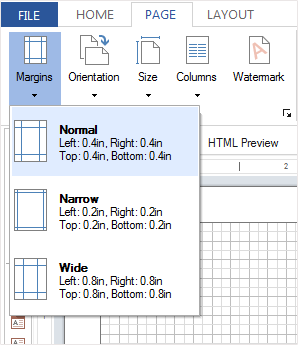 Now consider the example of setting margins. Predefined fields can be changed on the Page tab with help of the Margins command.