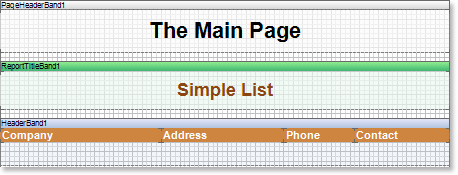 On the picture above shows how bands can be placed on a page. Here one can see top-down the Page Header, Report Title, and Header bands.