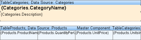 After filling the MasterComponent component two tables will be related to each other. When printing one data row from the Master data source (and, correspondingly, printing the Master table), the printing of appropriate rows from the Detail data source occurs (and, correspondingly, printing the Detail table). The Detail band will not be printed separately, only in relation to the Master band. On a picture below two related tables are represented.