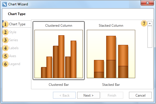 The Chart wizard is used to create reports with charts. The picture below shows a window of the Chart wizard.