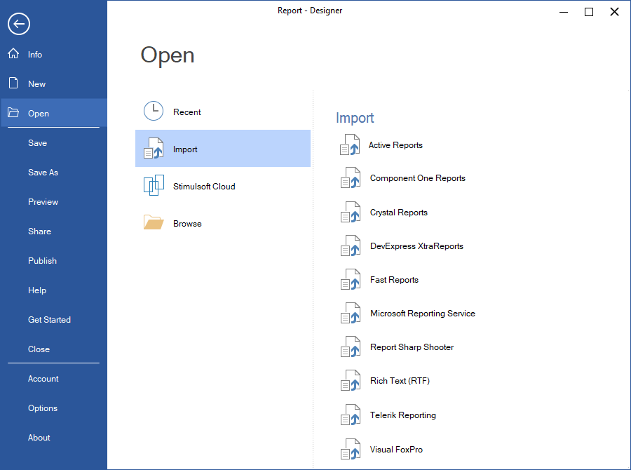 In some Report Designers, the Import option may be missing from the Open menu. In this case, you can use the Import Utility to import reports and then work with them in Stimulsoft products.