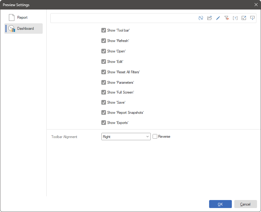 In the report designer, you can customize toolbars to preview a report or dashboard. You can do this in the Preview Settings editor. To call this editor, you should do the following: