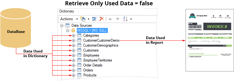 In this case, when rendering the report, data will be transferred from the database for each table in the data dictionary, and then the dictionary in the report itself. In other words, every table will be filled with actual data. Then, the report generator, selects the data used in the report and displays them in a structured way. Time of the report rendering depends on how fast data is transferred and the data size. The faster the data will be transmitted, the faster the report will be rendered. The picture below schematically shows the data transferring, if the Retrieve Only Used Data property is set to false: