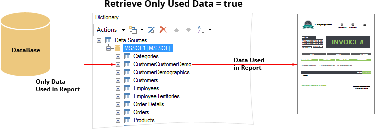 In this case, when rendering a report, the report generator will analyze the report structure and transfer data only for tables used in this report. In the current example, the data will be transferred only for the CustomerCustomerDemo table. The rendering time of the report, in this case, will be much less. If the report will be used by more than one table, the data will be transferred to the several tables only. The picture below schematically shows the data transfer, if the Retrieve Only Used Data property is set to true: