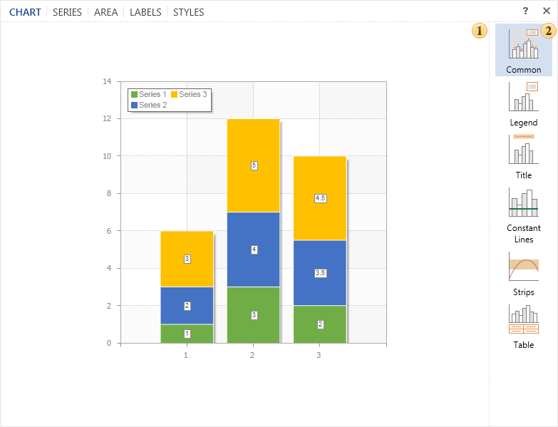 The group Common. Contains common settings such as a data source for the chart, the vertical/horizontal alignment, rotation angle and others.
